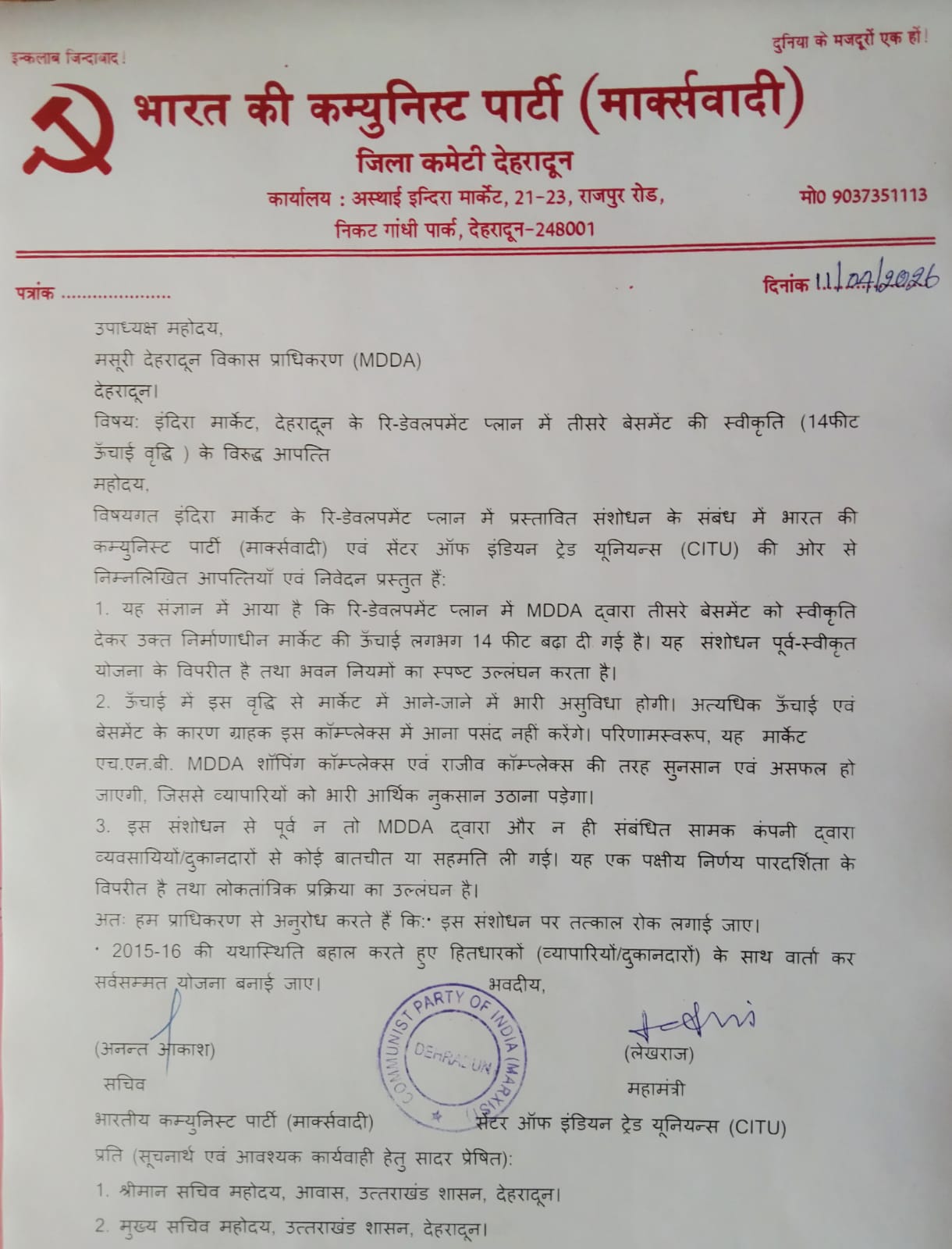 देहरादून। इंदिरा मार्केट के रि-डेवलपमेंट प्लान में प्रस्तावित संशोधन को लेकर विवाद खड़ा हो गया है। भारत की कम्युनिस्ट पार्टी (मार्क्सवादी) और सेंटर ऑफ इंडियन ट्रेड यूनियन्स (CITU) ने तीसरे बेसमेंट की स्वीकृति का विरोध करते हुए मुख्यमंत्री, मुख्य सचिव, आवास सचिव और संबंधित अधिकारियों को ज्ञापन भेजा है।